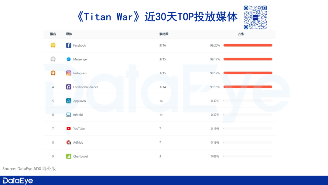 在投放端口和媒体方面,《Titan War》在Facebook、Messenger、Instagram和FacebookAudience四个全线投放,平均投放素材量超过3700组。这四个媒体端口也是《Titan War》一贯的选择。