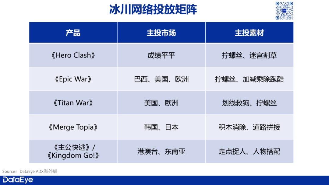 过去提到冰川,业内的普遍印象中是《超能世界》、《X-Hero》,以及加减乘除跑酷、拧螺丝、划线救狗、走点捉人等副玩法素材。实际上,今年以来冰川的产品、打法,开始呈现矩阵形态,具体情况如下: