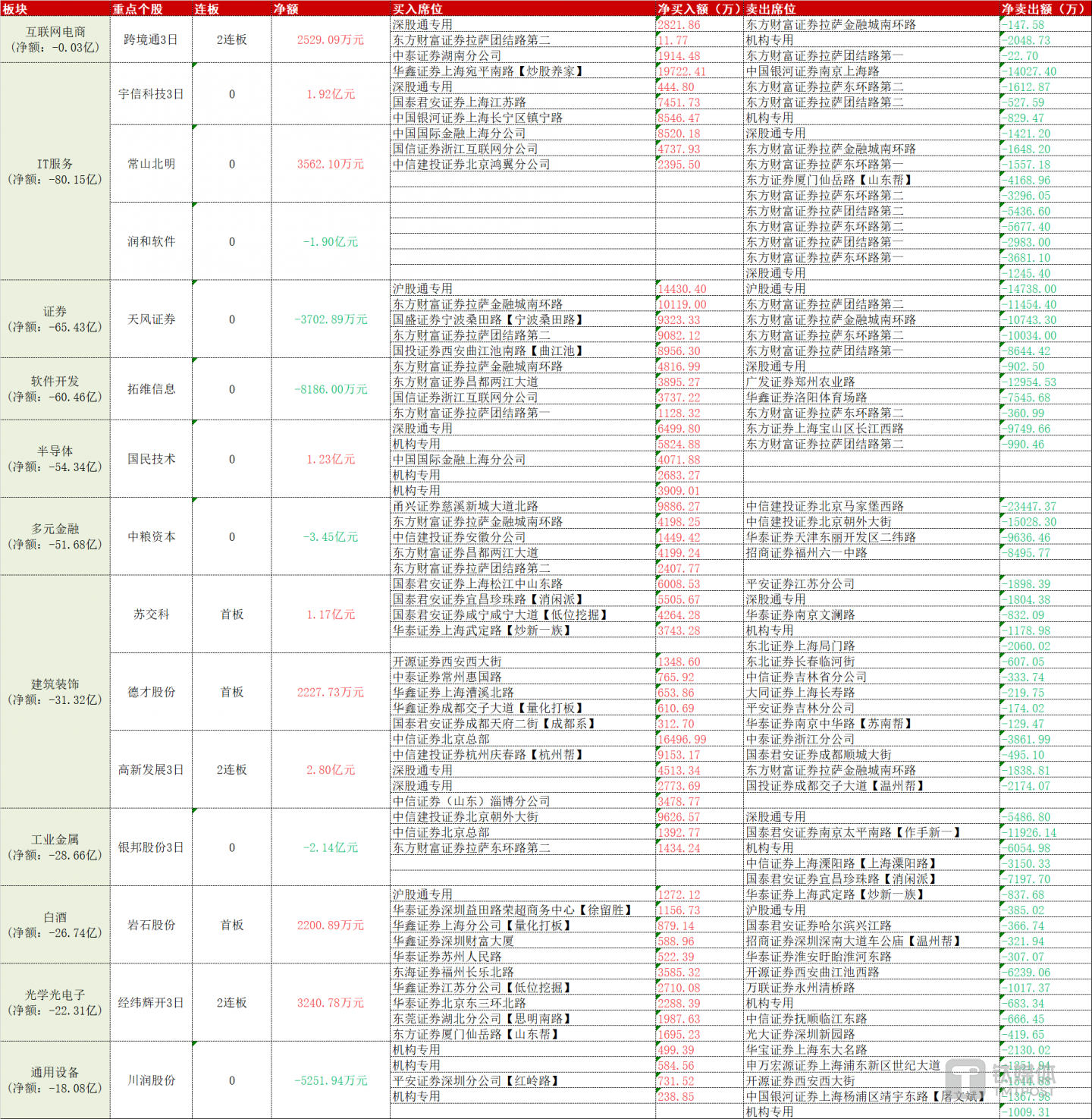 今日仅15只个股龙虎榜净额超2000万,较前几日有锐减,资金活跃度下降,净额过亿家数也锐减。东财拉萨营业部霸榜占比加大,抱团“列队”IT服务概念股和券商个股净卖榜。