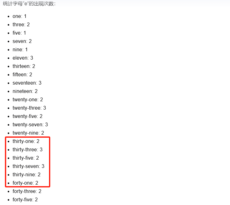 在我问及“1到100之间奇数的英文单词有多少个字母‘e’”的问题的时候,虽然Kimi表现出了较强的逻辑性,但在具体的数“e”上却翻了车——以图上红框内的英文数字为例,thirty-one中明明只有一个“e”,但Kimi探索版却给出了错误的回答。
