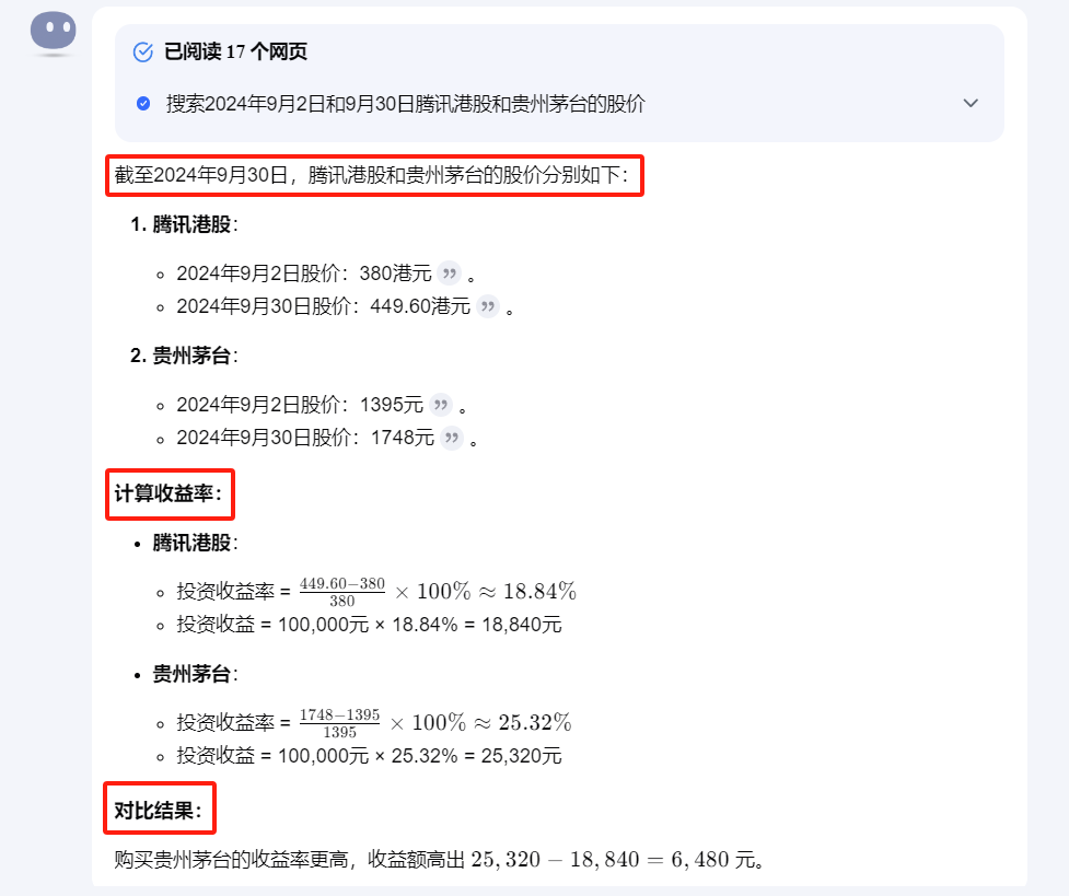 而Kimi探索版的思考过程也确实如此,将这个问题分为了①查询——查询两个时间点上两只股票的价格②计算——计算各自收益率③结论——给出购买贵州茅台收益率更高的结论,并输出具体高出的收益额有多少。