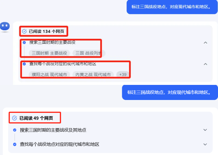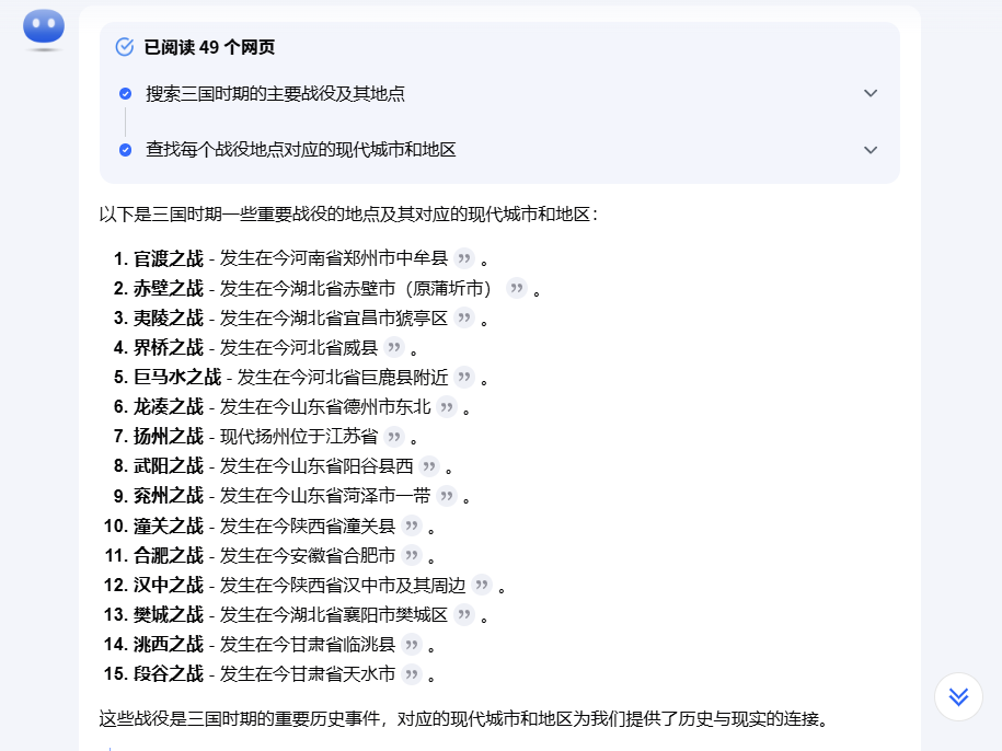 但是,回到“标注三国战役地点,对应现代城市和地区”这个示例问题上来,有的博主在搜索过程中就会出现阅读134个网页的情况,而我在亲身体验中则只能搜索49个网页的资料,得出的结果也有所不同。那位博主的答案不出所料地比我更加全面。