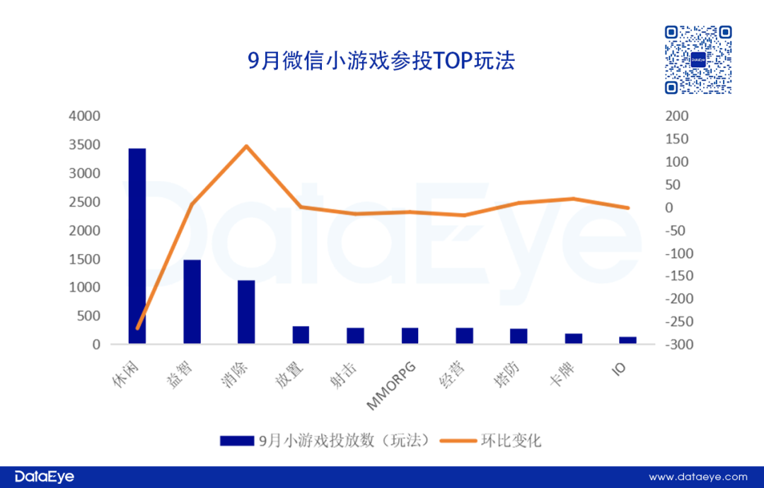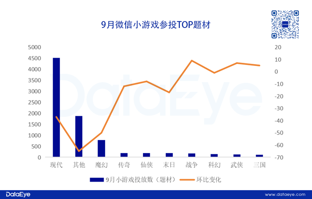 DataEye-ADX数据显示,9月参投微信小游戏玩法TOP10分类,休闲、益智、消除占比位列前三,其中消除玩法增长明显,环比增加约150款产品,轻度休闲玩法竞争激烈。题材TOP10分类中,现代题材占比最高,其他题材排名第二,魔幻题材排名第三。