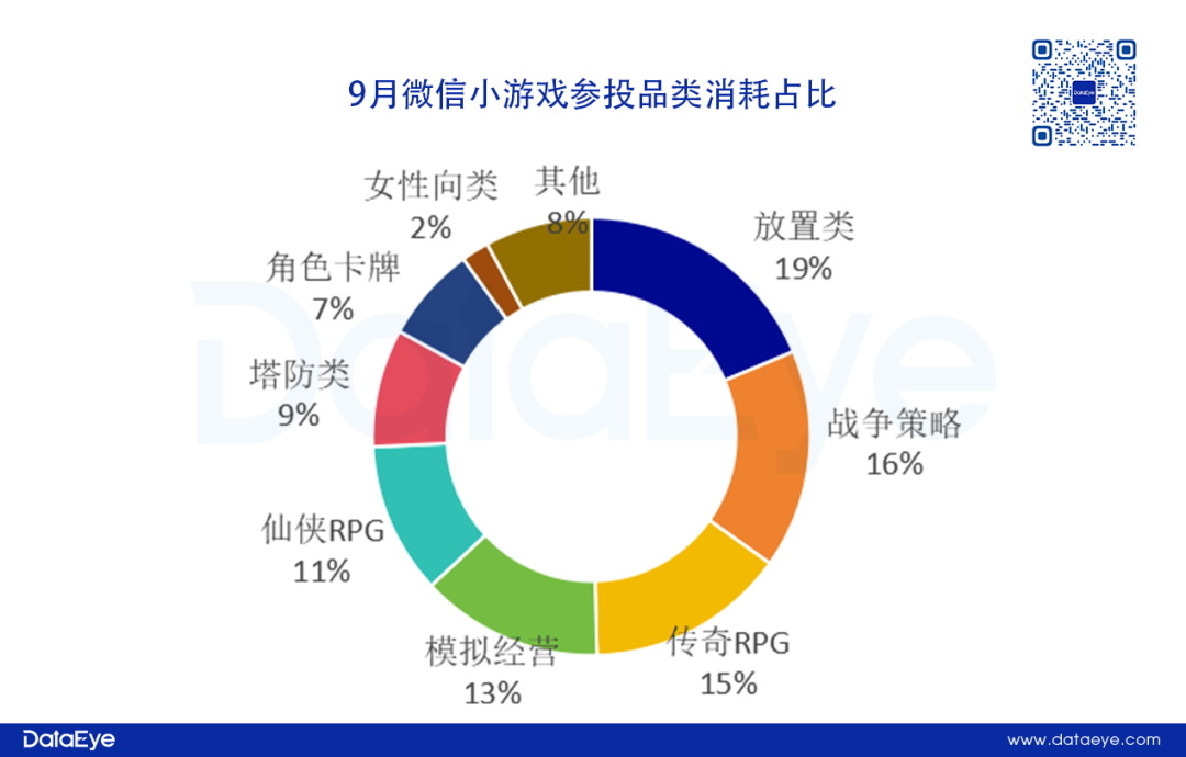 消耗第一梯队,放置品类消耗占比下滑。9月,放置(含开箱)类消耗占比约为19%,环比8月下滑了2个百分点。小游戏头部品类消耗占比持续下滑,侧面反映出目前小游戏赛道的高活跃度,品类多元化也意味着市场机会更多,小游戏发展空间仍巨大。