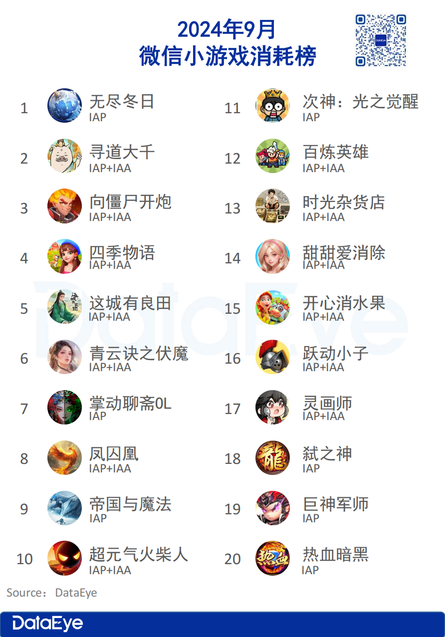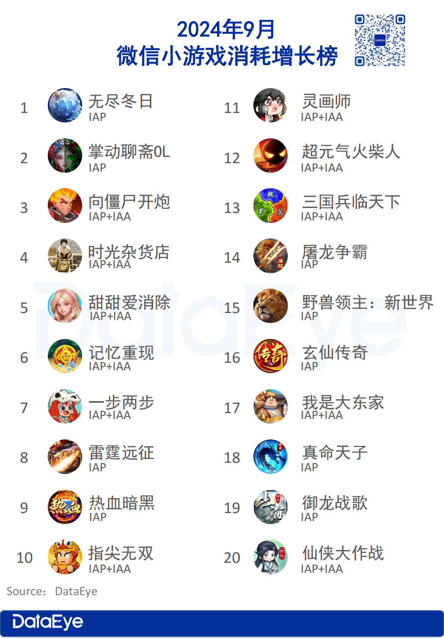 从消耗增长榜来看,多款老产品消耗增长明显,传奇、SLG品类多款产品上榜。9月消耗增长榜TOP20有多款老产品入榜,其中《无尽冬日》登顶消耗增长榜榜首,而且在本月冲到月度总消耗榜第一。《向僵尸开炮》排名的增长榜第3,持续向月度消耗榜TOP2冲击。