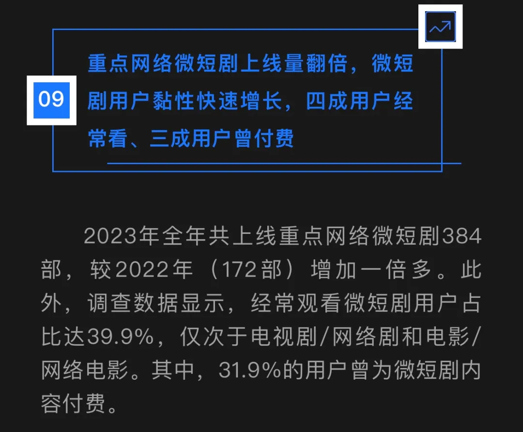 据《中国网络视听发展研究报告(2024)》,2023年全年共上线重点网络微短剧384部,较2022年(172部)增加一倍多。