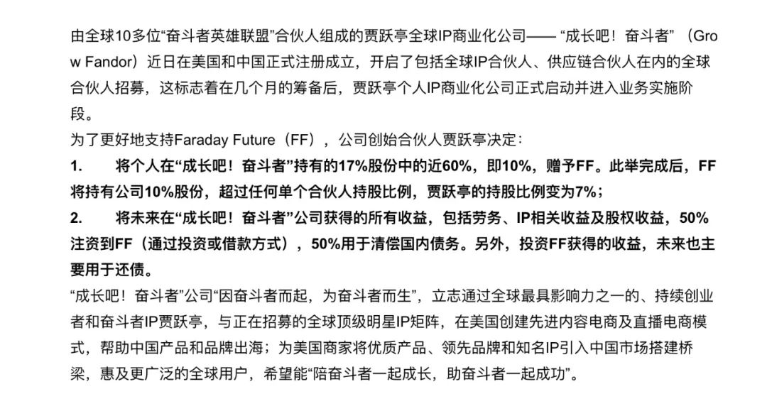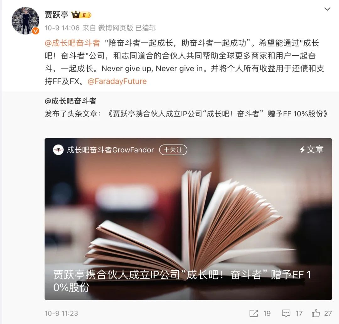 再到10月9日,贾跃亭在微博上转发了ID为“成长吧奋斗者”的推文,文章标题是《贾跃亭携合伙人成立IP公司“成长吧!奋斗者” 赠予FF 10%股份》。