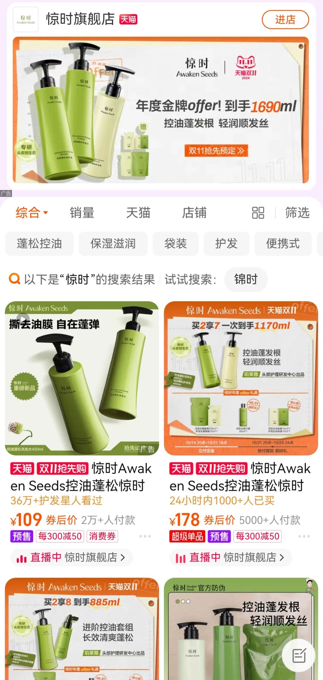 典型例如阿道夫,2021年,这个飞速发展的国产洗护品牌推出了脱育发洗发水套装,持有国家药品监督管理局颁发的育发类产品证书,并于当年618前夕携手白敬亭打造明星同款,于大促期间彻底打爆。