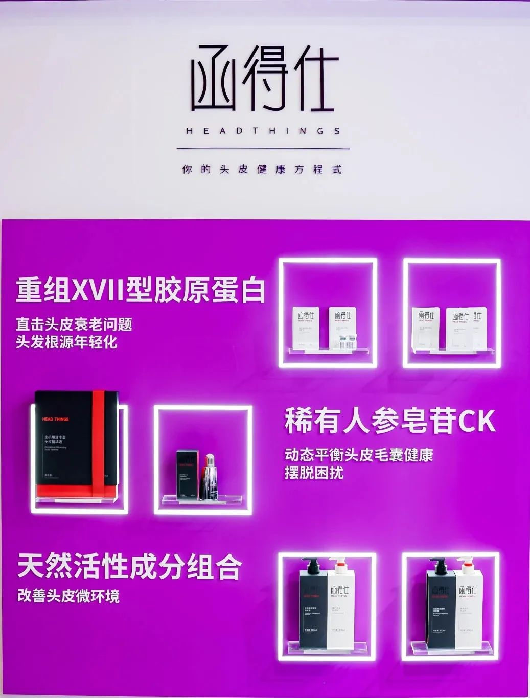 无独有偶,2024年5月的中国美容博览会上,巨子生物也宣布旗下洗护品牌函得仕中加入了独家专研成分重组型17型胶原蛋白和稀有人参皂苷CK和天然活性成分组合。但这次概念有了进一步升级——改善头皮微环境,也彻底将美妆集团的洗护概念卷至新高度。