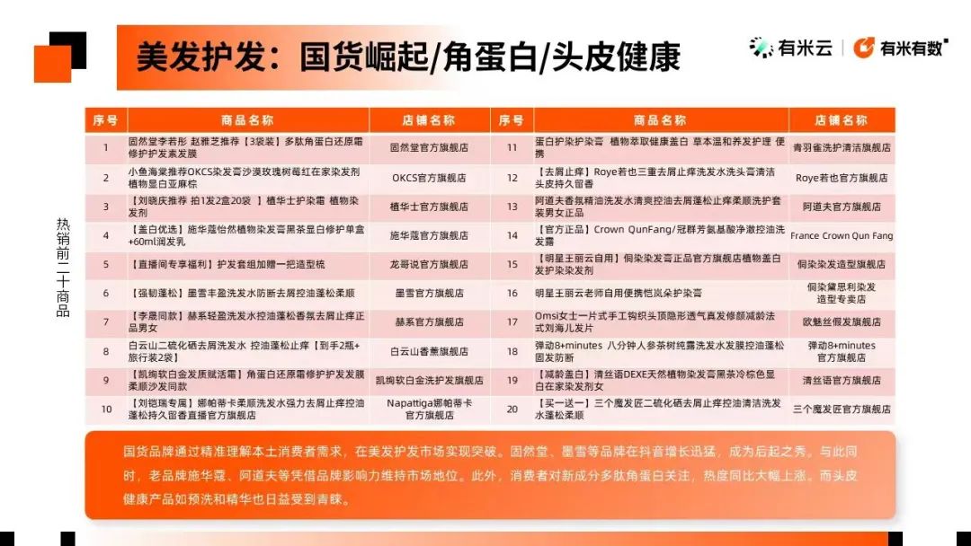 同样,据有米云数据显示,今年1-6月,个护美体品类在抖音全品类销售额占比中提升5%,其中100-300元的中高端市场增速最快,销售额排名第一的美发护发赛道,TOP20榜单中90%为国货品牌。
