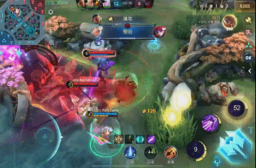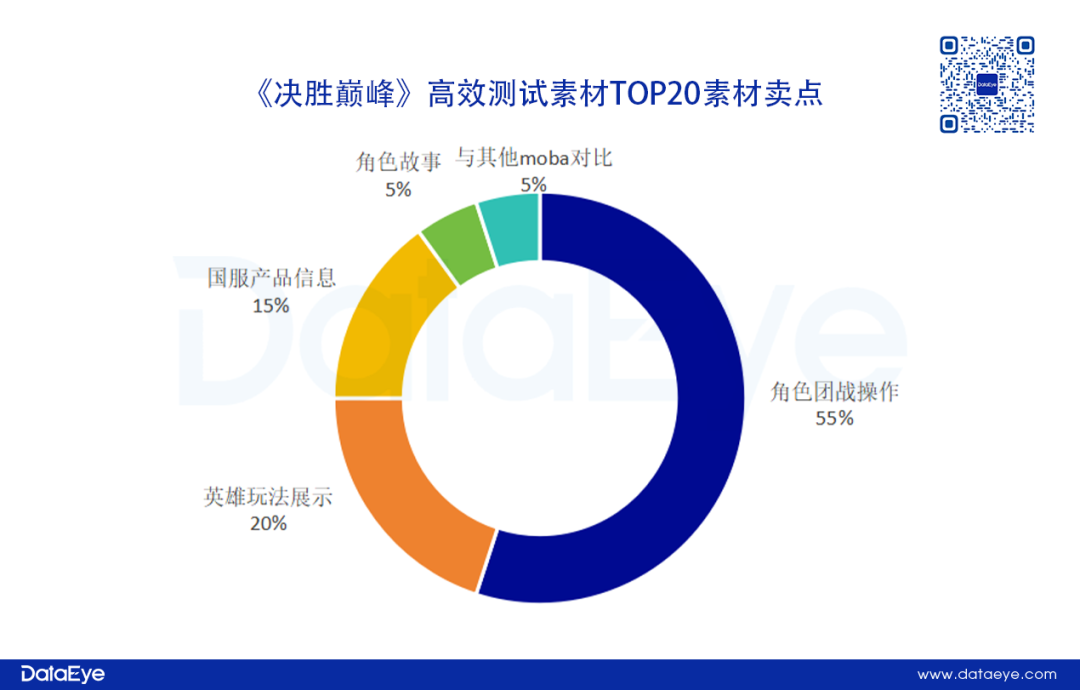 从创意卖点来看,围绕团战&角色展示。《决胜巅峰》关于“角色团战操作”的素材占比超过50%,这类型素材主要展现游戏团战中,单个角色的操作表现。而有20%的素材内容则是以角色技能招式为主,以对应游戏画面的方式展示角色技能。