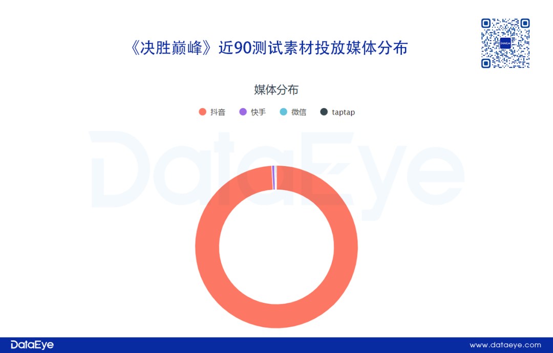 在媒体平台方面,ADX数据显示,《决胜巅峰》99%的素材,都投到了抖音。但是也有极少部分素材投到了微信、TapTap、快手上。