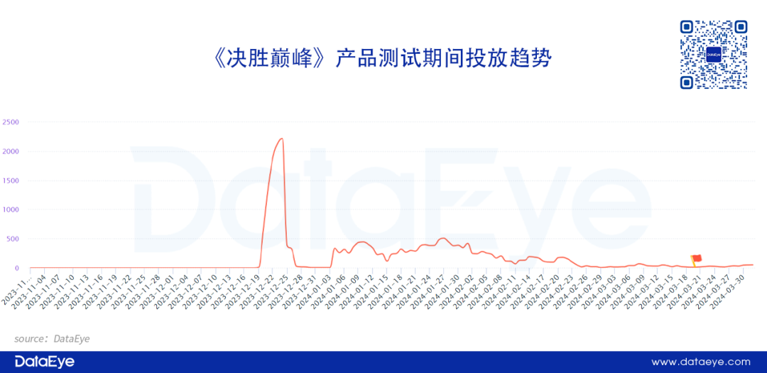ADX数据显示,早在2021年09月26号,《决胜巅峰》就开始投放测试素材。不过,大规模测试素材出现在2023年12月底-2024年2月,当时最高峰一天投放2200(视频+图片)测试素材。彼时《决胜巅峰》开启了“当归计划”限量不删档测试。