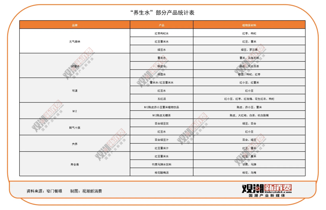 所谓养生水,大多是以符合药食同源特征的食药材为核心原料,配方简约,基本是“食药材+水”的组合搭配。