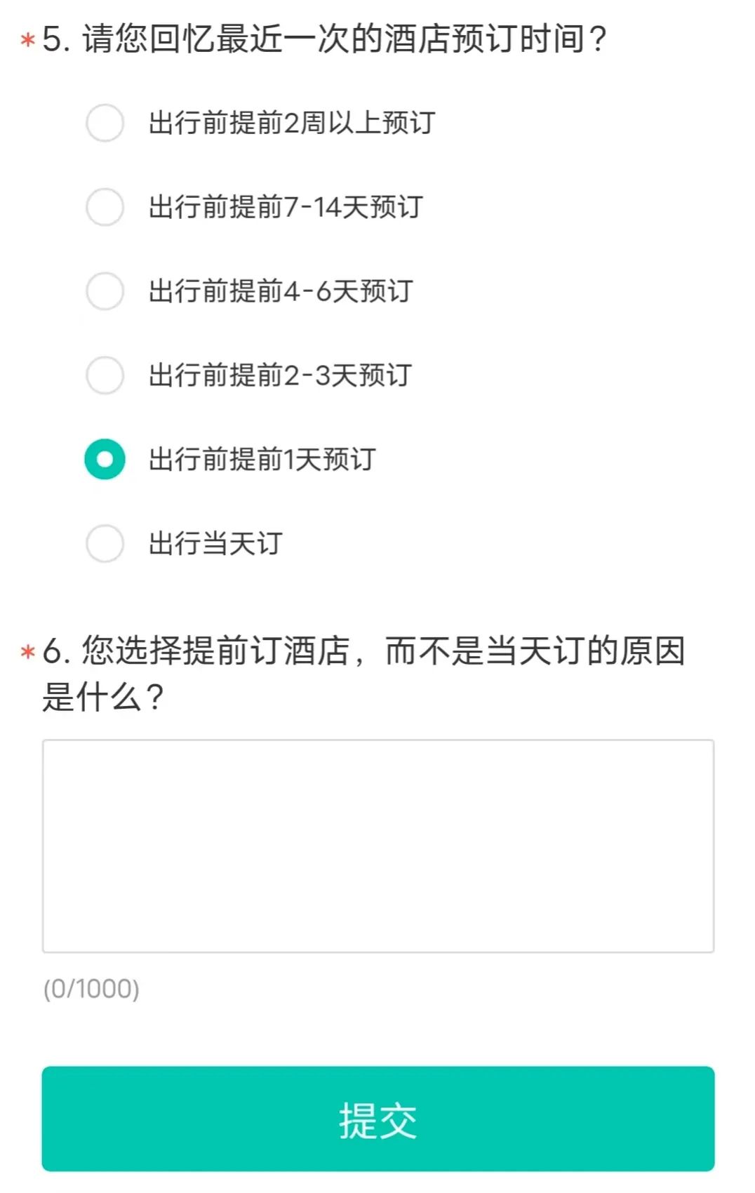 王蕾认为,“先囤后付”是对预售场景的强化,意味着平台主动为用户降低了消费门槛。她注意到,9月底,美团后台推送了酒旅相关的调查问卷,最后两个问题分别是最近的一次酒店预订时间和这样选择的原因。“除了最后一个当天预订的选项之外,其他所有选项都是提前预订,只是提前的有多有少。感觉他们可能也是在评估什么,才会问这些内容。”