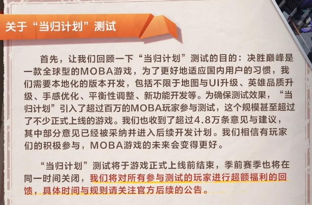 同时透露,今年初开启的“当归计划”测试共吸引了国内超过百万MOBA玩家参与,收获了4.8万条宝贵的意见与建议。这表明,《决胜巅峰》即将在中国区——MOBA世界版图的最后一块空白地,正式点亮其光芒。
