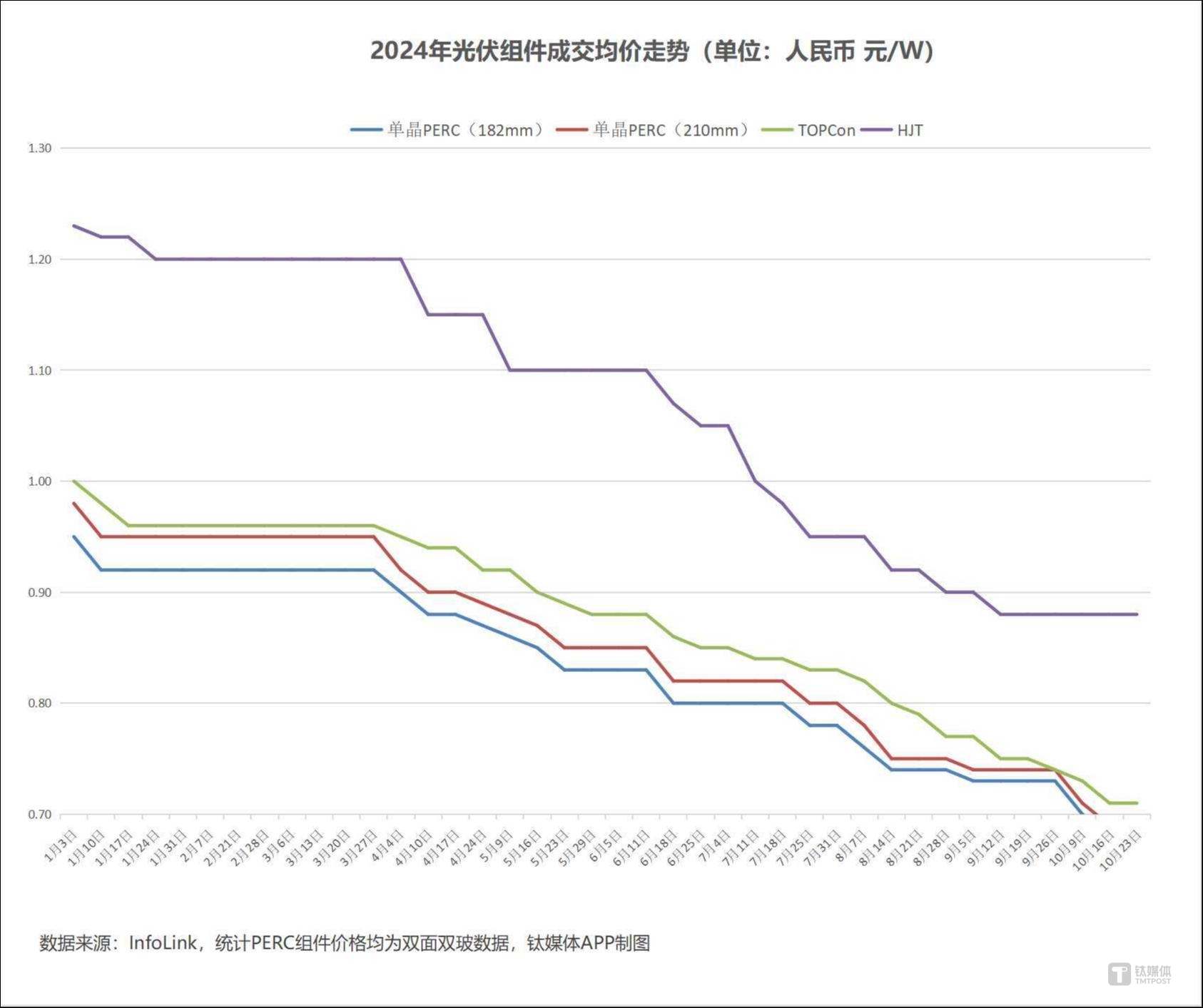 2023年,我国光伏单年新增装机量暴增到216.88GW,同比增速高达148.1%,自2020年开始的这轮超高速发展期的“油门”看起来已经踩到了底,与此同时,上游制造业经营情况却每况愈下,去年下半年“降价潮”愈演愈烈,四季度厂商亏损成风,及至今年上半年,A股光伏设备板块营收TOP5的营收、净利润同比均双降,净利降幅更是全部超过了68%,昔日“光伏第一股”隆基绿能净利同比下降157.13%,半年“血亏”52.43亿元,其他行业龙头如通威股份也亏超30亿元;三季度,“行业自律”“行业自救”成了流行词,行业协会、有关专家纷纷表示应从“反内卷”“杜绝价格战”做起,以实现行业健康可持续发展。但至少就短期来看,价格端的压力仍然很大,以李钧所在的组件环节为例,今年以来组件环节价格已下降了近30%,相比去年上半年的高点更是跌超60%,而这在主材四大环节(硅料、硅片、电池片、组件)中,还是跌幅最小的。根据InfoLink的最新统计,截至10月23日,单晶PERC(182mm)组件最低成交价0.65元/W,最高0.78元/W,成交均价仅0.68元/W,作为新一代技术代表的N型TOPCon组件成交均价也跌至了0.71元/W,这一价格已低于不少组件厂的现金成本线,企业入不敷出,才酿成前述亏损“惨案”。