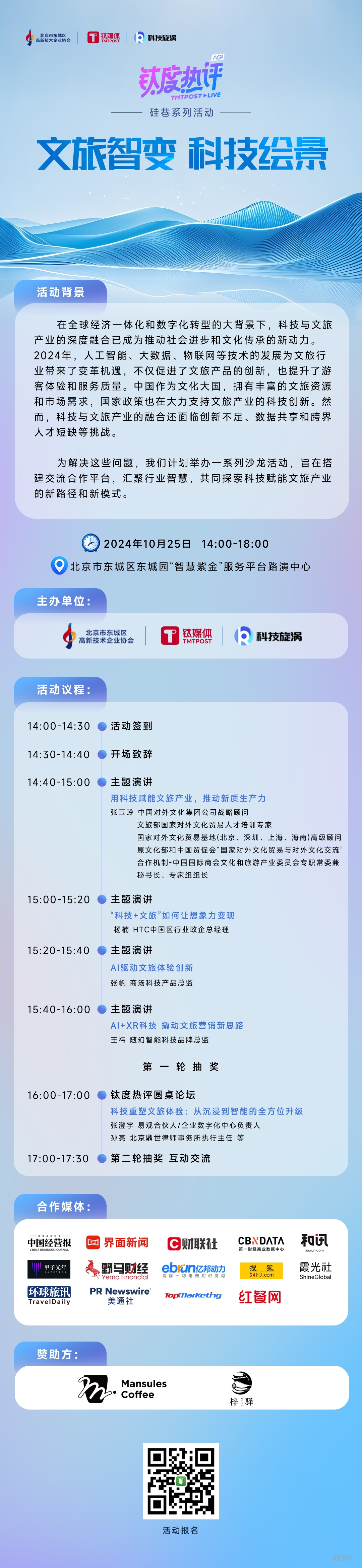 10月25日,《钛度热评》AGI特别栏目的首期线下沙龙将正式在北京市东城区东城园“智慧紫金”服务平台路演中心举行,本次沙龙以“文旅智变,科技绘景”为核心议题,邀请商汤科技、HTC、随幻智能等头部厂商,易观、鼎世律师事务所等专业机构从科技赋能文旅产业推动新质生产力,AI驱动文旅体验创新等角度,分析如何利用科技手段挖掘和传承中华文化精髓,提升文旅产业的国际竞争力。