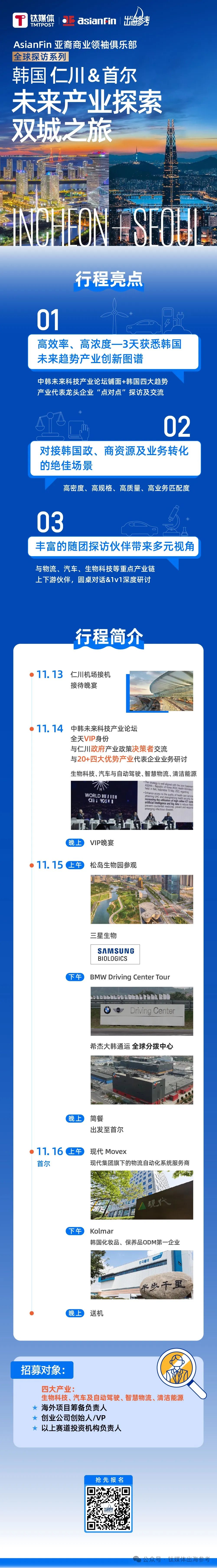 这个人口不到6000万的国家为何成为企业全球化最成功的国家之一?又为何能成为中企出海的重要通路?中国品牌还能向韩国学习什么?钛媒体和美国AsianFin亚财社共同发起的AsianFin Global Business Leaders Club(全球亚裔商业领袖俱乐部),将组织4天3晚韩国未来产业考察团,与韩国数十位政策制定者、当地龙头产业代表,面对面交流,并且深度走访三星生物、希杰大韩通运、现代等韩国龙头企业,挖掘新经贸结构下的中韩产业合作机会。(报名直达文末)