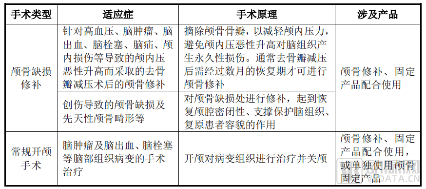 颅骨材料产品关联的疾病是颅骨缺损。作为保护大脑的屏障,颅骨缺损后,极易引起脑组织损伤。通过颅骨材料修补、治疗颅骨缺损,患者的颅骨形态将恢复正常。对应的产品包括颅骨修补产品和颅骨固定系统,如颅骨锁、颅骨网、颅骨钉、颅骨连接片、颅骨盖孔板等。