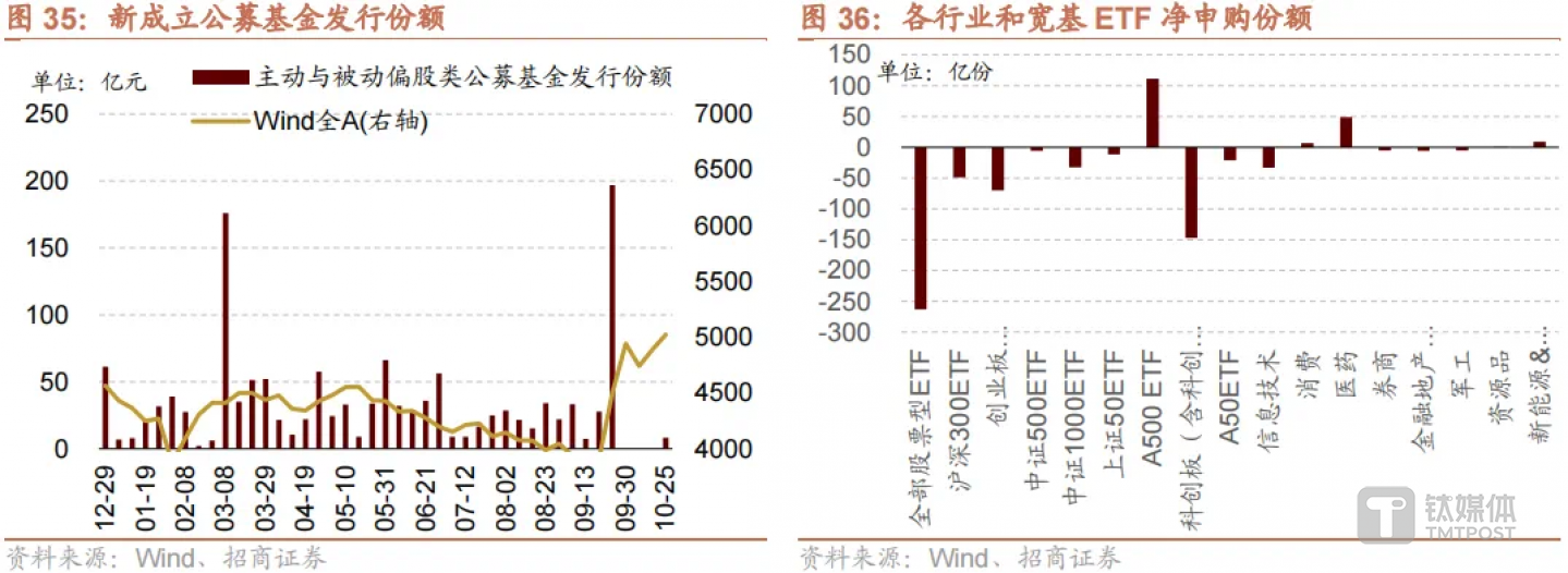 (1)被动基金规模增至主动偏股基金规模同等水平,股票型ETF持有A股市值达2.7万亿元。上周宽基中以A500流入为主,沪深300流出规模大于A500流入规模。