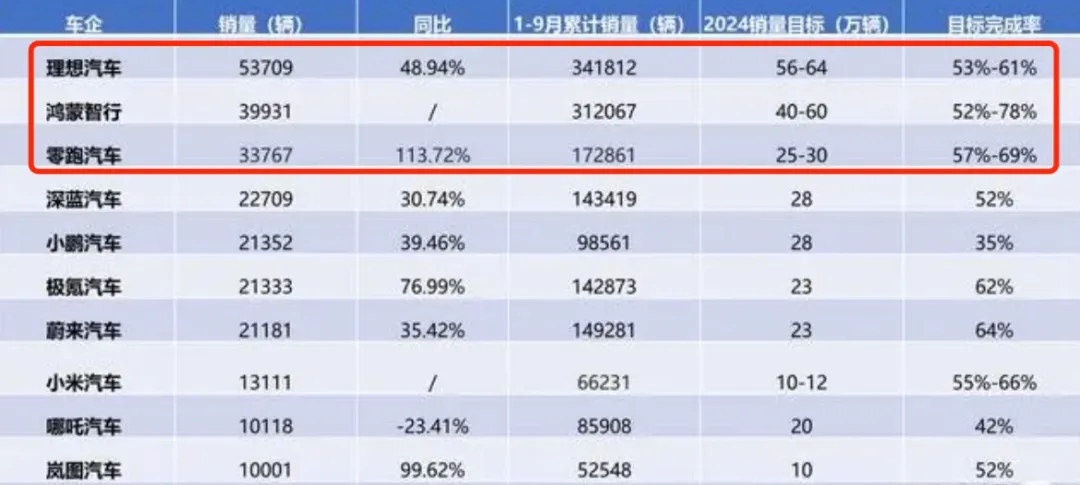 图/2024年9月新势力销量排行 来源/互联网 新能源观截图