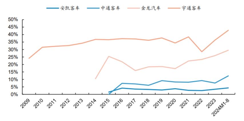 国内客车行业已经进入红海市场,且呈现寡头垄断市场格局。2024年前8月,在大中客车细分领域,宇通客车市占率为43%,较2023年继续提升7%。此外,金龙客车、中通客车、安凯客车排名第2-4名,市占率分别为30%、12%、4%,较去年均有所提升。