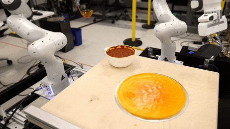 在这个过程里,披萨面团会随机移动,而机器人可以“随机应变”,它能跟随披萨面团中心位置的迁移而即时挪动勺子。