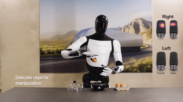 这双机械手已经拥有22个自由度,分布在手指、手腕和小指下方,而年初手部拥有11个自由度的第二代擎天柱,所有手指都具有触觉感应,能够灵巧地处理鸡蛋等易碎物品。