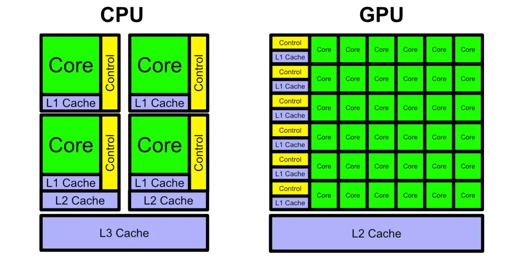 CPU 的架构需要大量的空间去放置高速缓存单元和控制单元,现代 CPU 在分支预测和乱序执行上的要求更高,不断新增的长指令集更进一步强化了复杂的逻辑控制单元,相比之下 CPU 计算单元只占据了很小的一部分。大规模并行计算方面,CPU 天然的效率很低,更适合处理复杂的逻辑控制和通用计算。