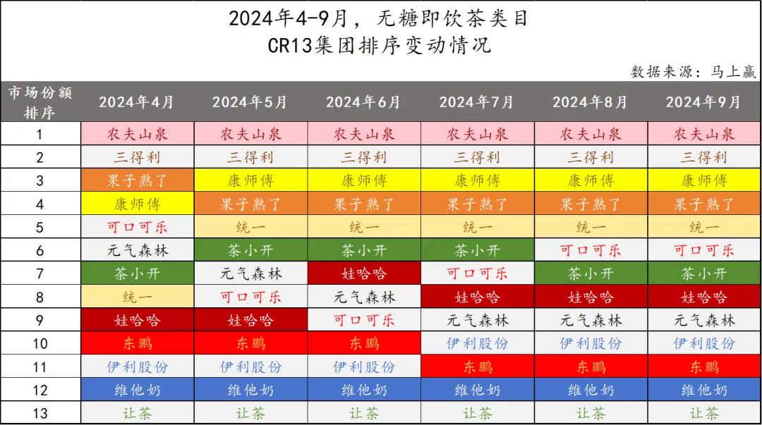 根据马上赢数据显示,纵观整个2024年4-9月的,前13名集团排名变化,可以看到:除了头部的农夫山泉和三得利之外,名次的变化在3-11位之间发生了剧烈的波动。3、4名的康师傅、果子熟了有短暂换位,但在5月以后康师傅还是稳定在第三名的位置上。值得关注的是,统一上升较快,从4月的市场份额第八名,到5-9月持续稳定在第五名的位置,是进展较为稳定的集团之一。