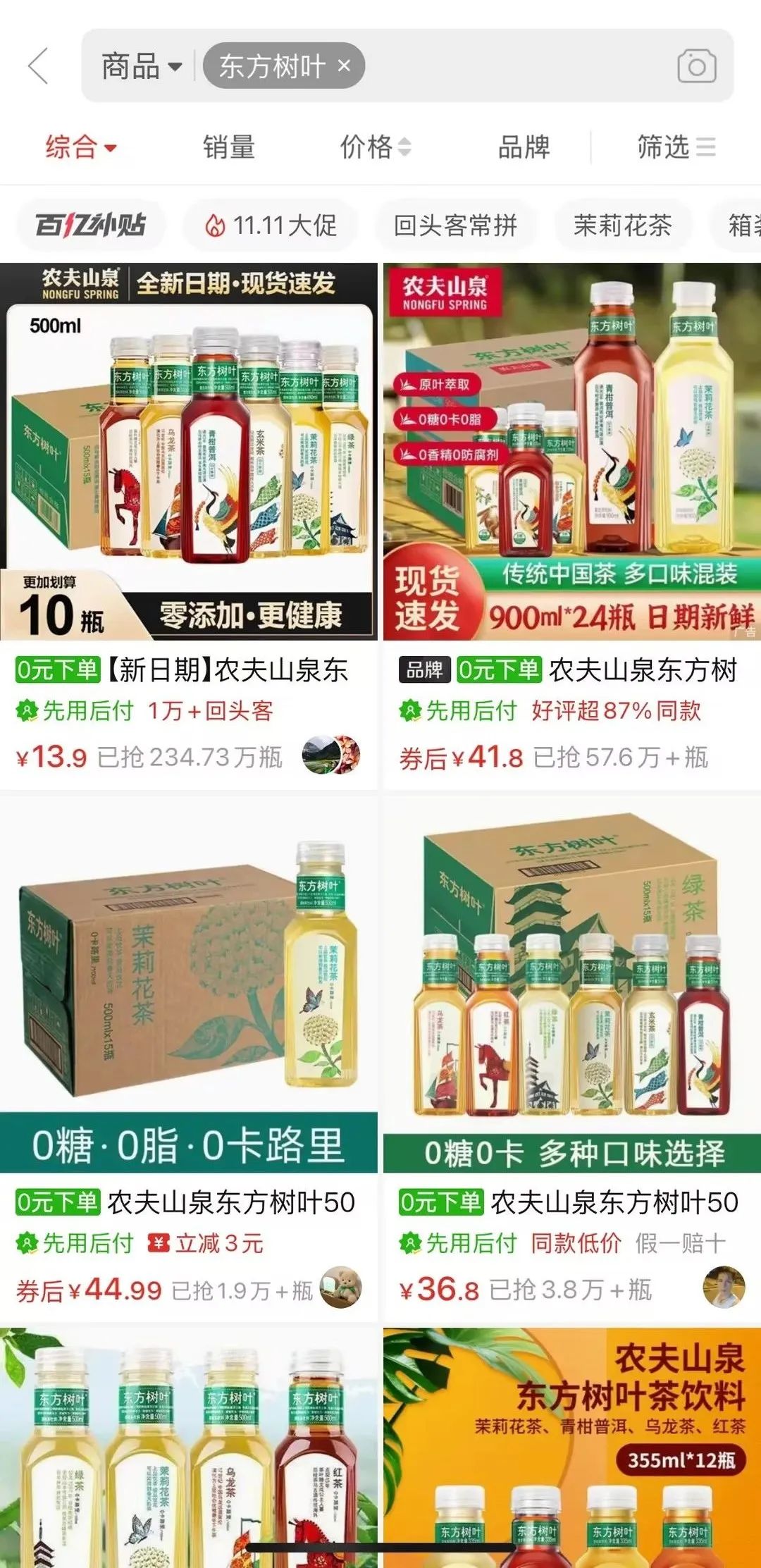 先是淘宝、拼多多、然后再抖音、快手,最后甚至连美团,几乎每个平台的东方树叶价格,都有一定幅度的降价,拼多多加上百亿补贴已经低至1.8元,而淘宝的优惠甚至让500毫升的东方树叶低至了1元以下。而许多活动甚至直接从官方渠道发出,似乎带着某种趋势性意味。