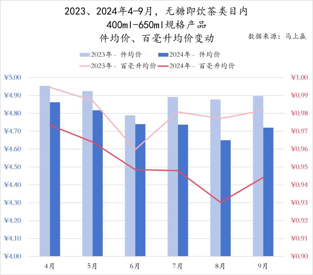根据马上赢的数据统计来看,在2024年4-9月,市场无糖即饮茶销售额的同比增速明显低于出货量,反映出无糖即饮茶产品在规格扩充的同时也有一定的均价下降。在400-650ml规格带范围内,件均价与百毫升均价同比来看均有幅度不小的下降。