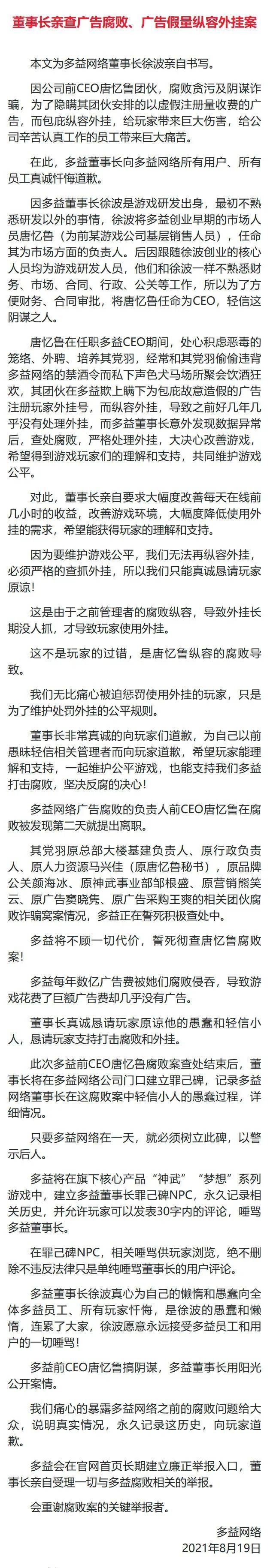 不同于网易雷厉风行式的公告、报警一条龙,多益的做法是清退涉事高管及员工,还悬赏千万元公开征集贪腐线索证据,颇有些“全民反贪”的意味。当时多益旗下《神武》流传着“无脚本,不神武”的说法,但贪腐案一结,《神武》便奇迹般少了不少“外挂”。而且为了惩治脚本,游戏还加大了封号力度,大有“红海行动”的戏剧感。