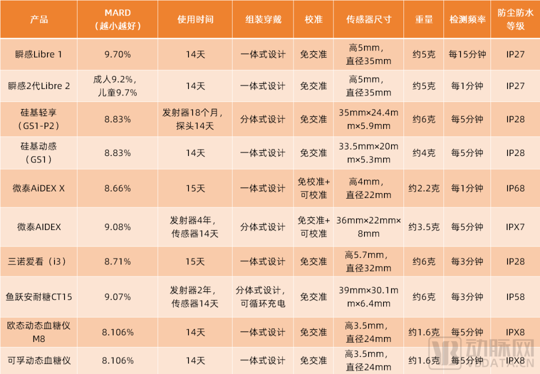 (市场上主流CGM产品性能参数,动脉网统计)