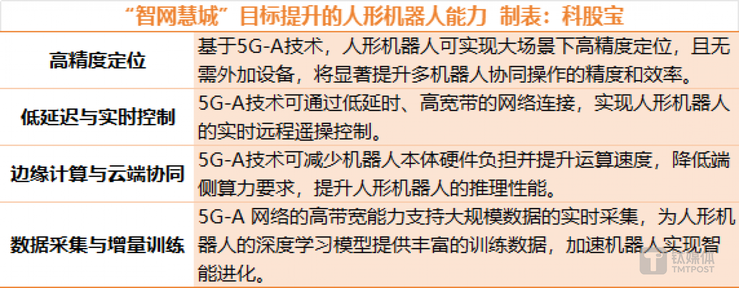 论坛显示,“智网慧城”计划聚焦5G-A、AI、人形机器人等技术创新,目标是进一步提升人形机器人的高精度定位、低延迟、实时控制、数据采集、增量认练等能力,打通人形机器人商业化的“最后一公里”。5.5G(或称“5G-A”)是5G向6G演进的关键技术,也被称为5G增强版。相比于5G,5G-A的速度快了10倍。