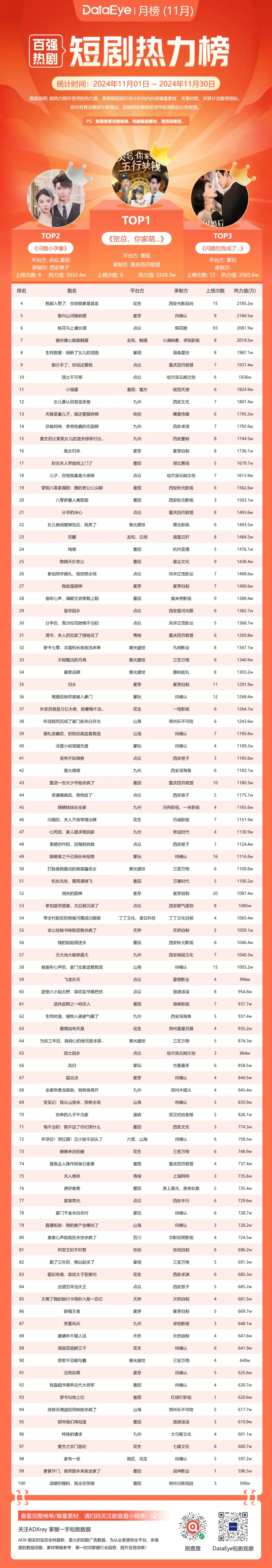 11月DataEye短剧新品榜(按热力值),番茄的《贺总,你家萌宝五行缺钱》登顶,花生《我都入赘了,你说我爹是首富》第二,麦芽《敢叫山河换新颜》位列第三。