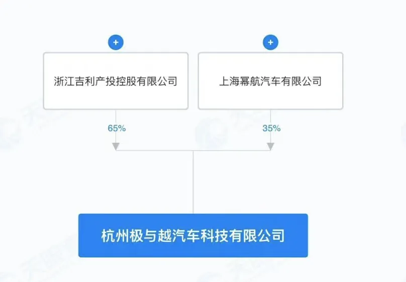 吉利跟百度还通过股权关系进行了绑定,分别持有杭州极与越汽车科技有限公司65%、35%的股份,孵化出“极越”品牌,首款车型为极越01。
