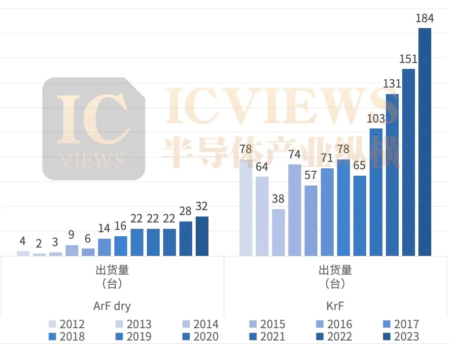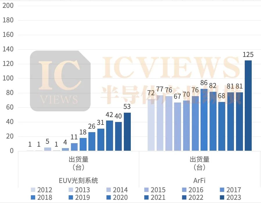 如果按照光源类型划分,不仅有EUV光刻机,还有ArF浸入式光刻机、ArF干式光刻机、KrF光刻机、i-line设备等。其中,ArF、ArF和KrF都属于深紫外线光刻机(DUV),这也是当前半导体制造的主力。从2012年到2023年,ASML出货量2235台DUV光刻机。
