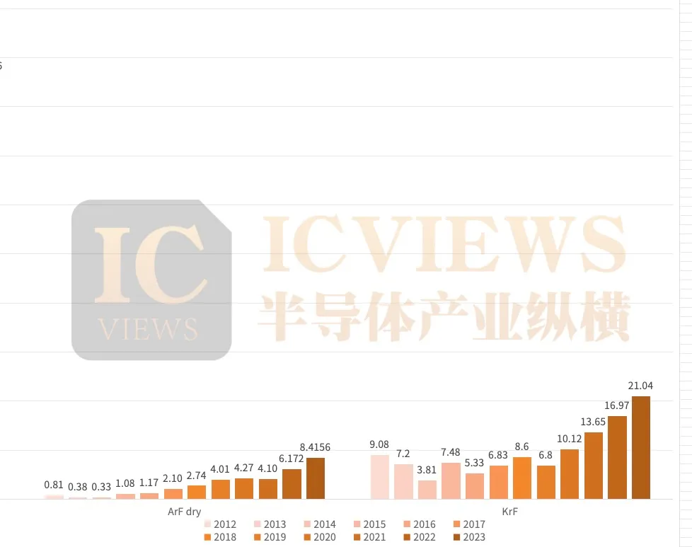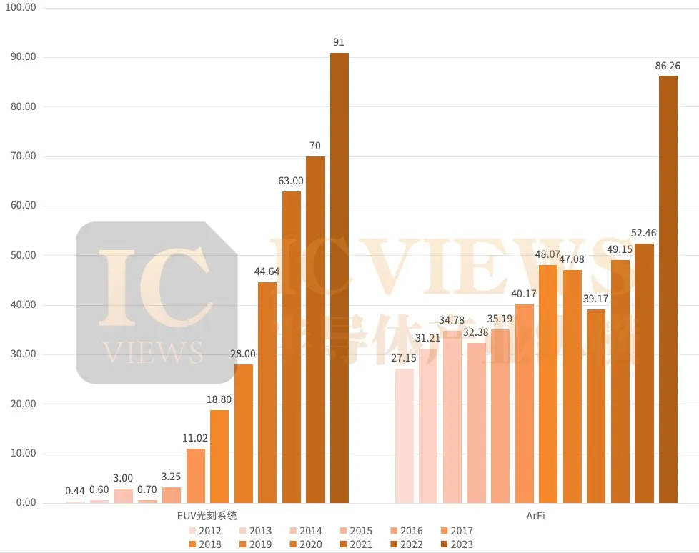 从2012年的出货量来看,ArFi和KrF等深紫外线光刻机(DUV)出货量远超EUV光刻机。毕竟,如前文锁述,能够量产的EUV也是在2013年才正式亮相。从上图来看,ArFi出货数量一直保持在70-80台左右,但2023年出现了暴涨,直接出货125台。KrF出货量原先也一直维持在70左右,但从2020年开始每年增长近30台左右。