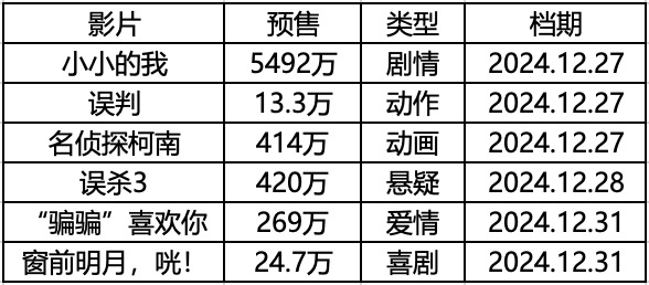 目前6部跨年档影片该变招的变招,该点映的点映,期待能够拿到一个市场高峰,为2024年划上一个圆满的句号,也为即将到来的春节档做好强势预热。