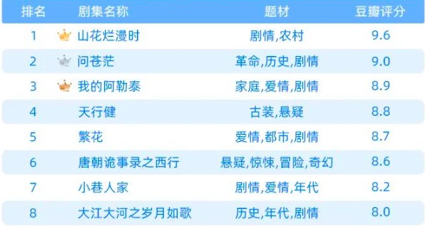 口碑上亦是如此。虽然有《山花烂漫时》以豆瓣9.6分的成绩成为近九年国产剧评分第一,但整体来看,今年豆瓣评分超过8分的剧仅有8部,而2023年则达到了25部。此外,口碑效应对观众热情的拉动也开始下滑,《山花烂漫时》《大江大河之岁月如歌》都未能以口碑兑换市场热度。