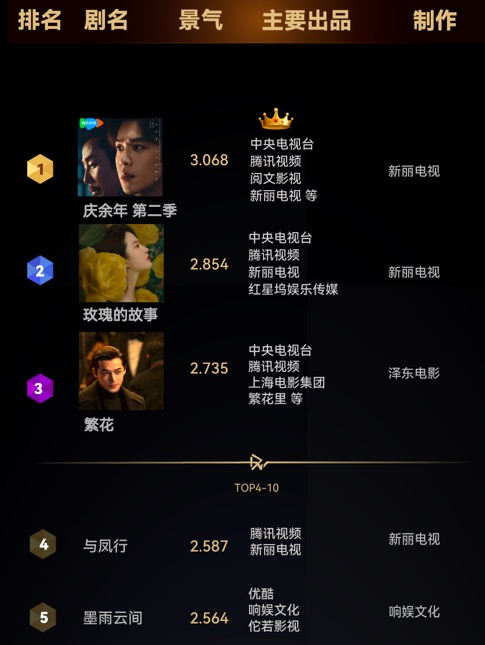 2024年国剧市场最亮眼的公司,无疑是阅文集团旗下新丽传媒。《庆余年第二季》《玫瑰的故事》《与凤行》皆是热度、口碑、招商双赢的头部爆款。德塔文电视剧景气指数榜上,这三部剧都位列top5。从题材上来讲,三部剧则分别巩固了其在IP系列化改编、古装剧创新、现实题材等赛道的市场占位。即将上线的《大奉打更人》,则是新丽传媒在古装市场投下的又一枚重磅炸弹,古装玄幻探案轻喜剧,自带观众缘。