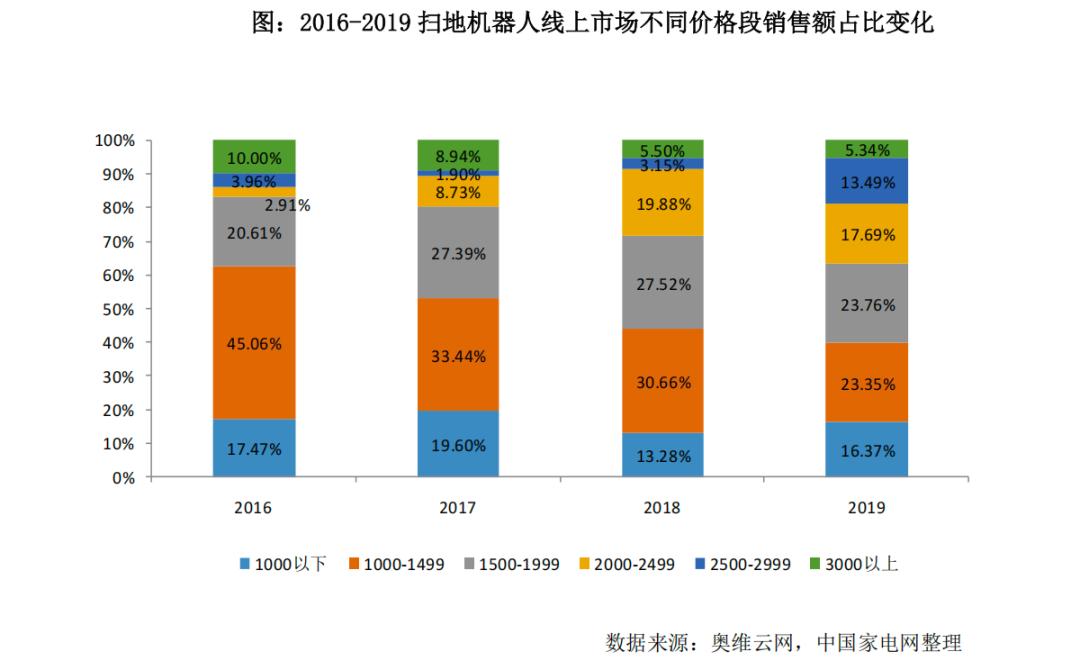 再往前倒几年,这一趋势也很明显。如下图所示,做个简单对比就不难发现:2019年以前,扫地机器人行业在销售额上增速最快的价格区间,依次是“1500-1999元”“2000-2499元”“2500-2999元”。