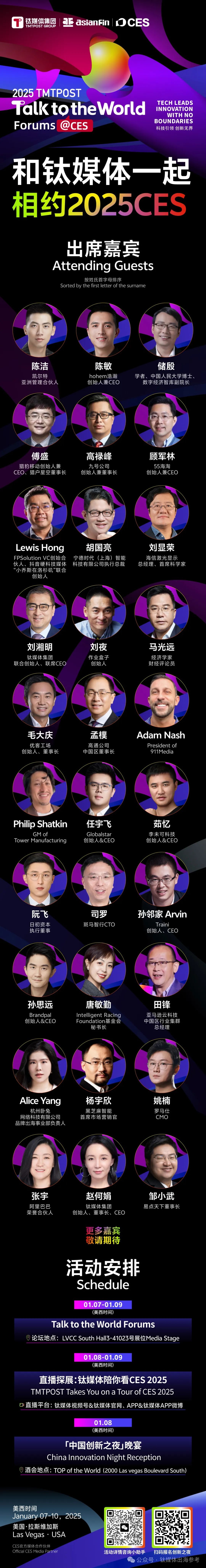 作为全球领先的财经科技信息服务平台和科技生态服务商,2025年CES,钛媒体「Talk To the World Forums·对话世界」系列论坛将于美西时间1月7日-9日在CES主展馆LVCC南馆举办。