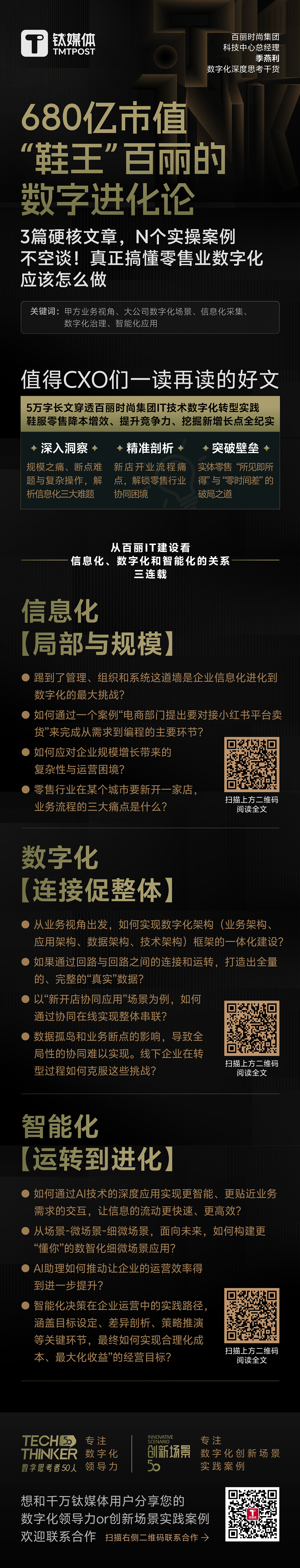此前,百丽时尚集团科技中心总经理季燕利在钛媒体发布过多篇数字化深度思考:《百丽的核心竞争力与数字化》 《从补货场景,看企业协同在线》 《从无数到有数,如何深入数据应用与治理》 《数智化在零售企业的应用探索》。