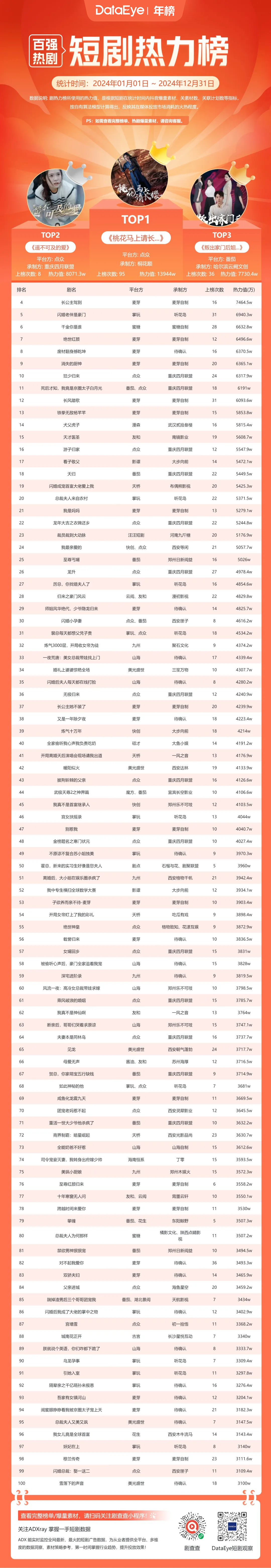 2024年年度热剧百强榜:百强热力值总额达44.403亿,《桃花马上请长缨》登顶,点众、麦芽、掌玩表现突出!