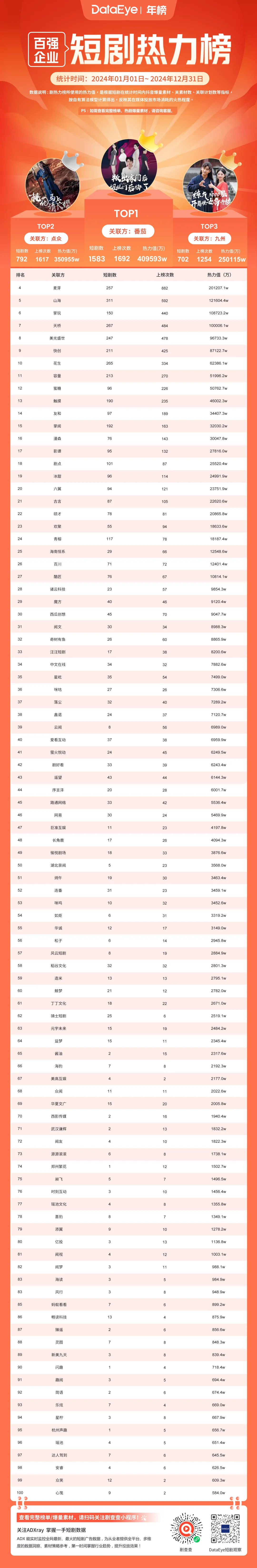 2024年度短剧百强榜-平台方:百强平台方热力值总额达249亿,番茄、点众、九州、麦芽、山海领跑!