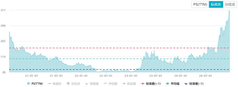 如此基本面,资本市场极为狂热,将寒武纪视为中国版的英伟达。截止1月2日,寒武纪市销率PS近400倍(PS主要用于评估那些尚未盈利或盈利不稳定的高成长性企业的价值),毫无疑问创下上市以来最高水平。