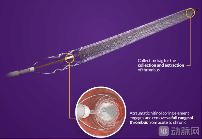 ClotTriever系统是一种经皮机械血栓清除装置,由可膨胀的镍钛诺收集袋组成,沿着静脉壁拖动,分离并捕获血栓,收集到回收鞘内。ClotTriever系统可用于治疗静脉血栓,甚至亚急性和慢性血栓,而不需要溶栓,且无潜在出血相关并发症。